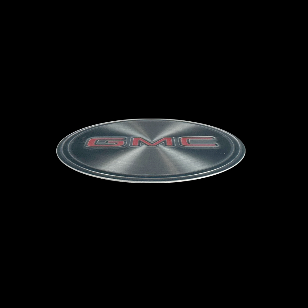Finish off your rally wheels with the correct 1977-87 Square Body GMC Truck Rally Wheel Hubcap Center Decal 2WD 1/2 Ton shown above with its brushed metal face and red GMC lettering. This emblem is designed to replicate the original factory GMC hubcap center logo used on 2WD 1/2-ton trucks, delivering the authentic look restorers and classic truck owners expect.