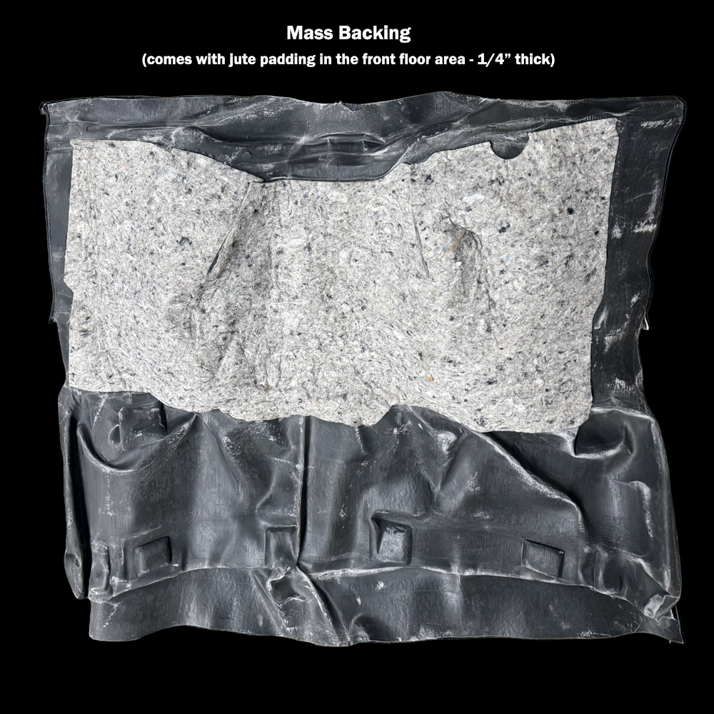 Mass Backing is going to cover the whole entire carpet and is formed and molded to the carpet. The mass backing is 1/2 inch thick sound deadener insulation. (We recommend)
